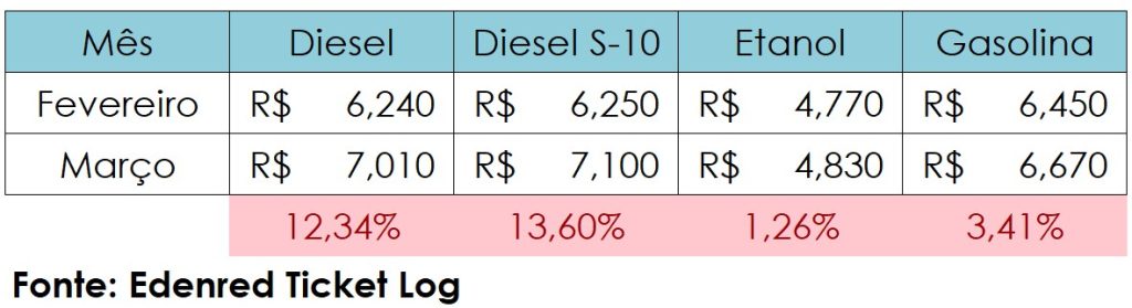Etanol e gasolina também seguiram em alta no mês, com aumentos de 1,26% e 3,41% em relação a fevereiro, com preços médios de R$ 4,83 e R$ 6,67 por litro, respectivamente.